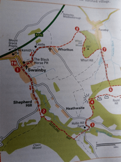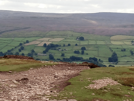 From here the path continues to twist and turn with ups and downs, slippy in places where the sun hasn’t dried up the patches of mud. It eventually comes out onto a bridleway. The walk on the card turns right through a series of fields, some with cows in, a sign warning walkers about this. I had already decided to continue on the bridleway as it meets the steep stony path I walked up at the start. This path stays on the same level, is grassy and wide. From here the village of Reeth comes back into view. It also runs parallel with the road out of Reeth to Fremington where I had parked the car and started the walk. As well as looking down onto Reeth I could look up and follow the path I had climbed three and a half hours earlier.