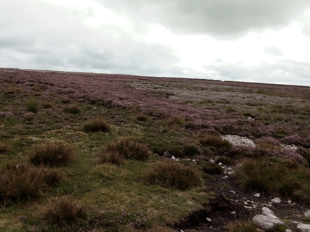 Along the path there are plenty of places in which to stop and take in the view back across the valley beyond Reeth to the fell tops of Reeth Low Moor and Harkerside Moor. These places could also be used as photo opportunities, or, resting places! The man on his bike had stopped in order to make the most of one of these spaces. He was still there when I reached him, so I stopped and had a chat, it would have been rude not to! The bike he was using was rented from the centre in Grinton and motorised. He told me it helped on the smoother parts of the track but was still tricky on the lumpier loose stones. As were talking another cyclist approached, carefully picking his way through, but not stopping. He had an amazing pedalling rhythm and was working hard to maintain it, his eyes fixed on the path. We both looked on in admiration. I made my goodbyes and wished him luck with the remainder of his journey, and continued up the hill, reaching the summit shortly afterwards. At the top there was a gate through a wall, giving the choice of staying in the area I was standing in or walking to the other side of the wall. I decided to go through the gate. For me this seemed the better path as I was able to get really good views back over Reeth again but also across this moor, Marrick moor, towards Helwith and Marske.