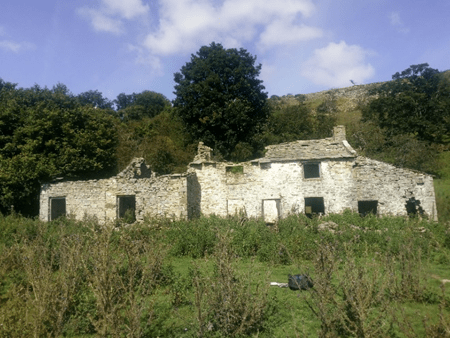 After going round the farmhouse the path is now above Arkle Beck and moving further away from it, going through fields and only slightly undulating. Passing through one of the fields, I notice a very interesting ruin, which certainly gets the imagination working overtime. It is a farmhouse, almost all intact, the doors and windows can be made out easily, as can the gar den gate and path. Inside, the buildings are overgrown and the only inhabitants are sheep, unless at night the ghosts of the families that lived there re-appear! With those thoughts in my head I quickly moved on.